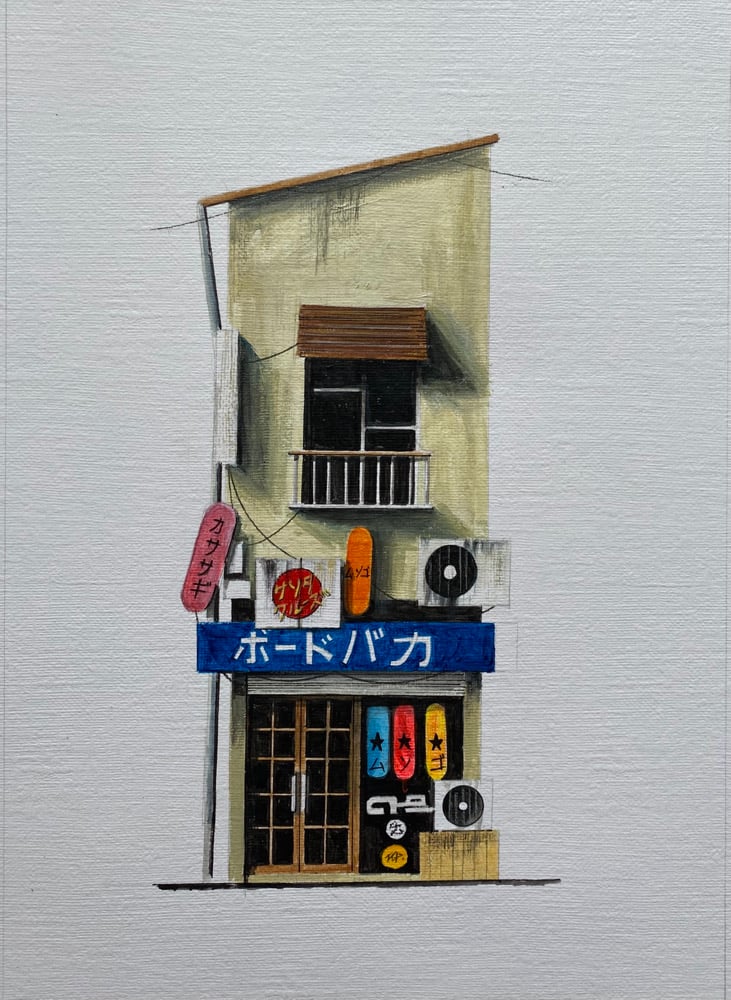 ‘I’ve wanted to do an illustration of a skateboard shop for some time, the subject matter lends itself well to a fictional, urban Tokyo- whilst the skateboards themselves add some colour to the building.’