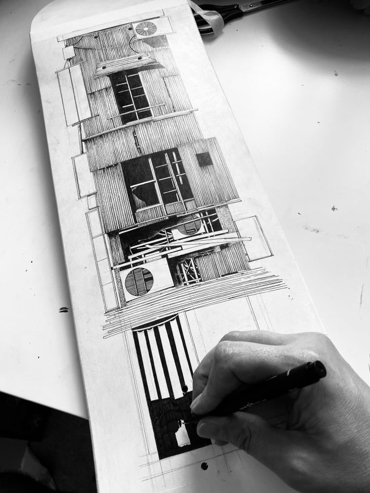 something a bit different but what I’ve wanted to do for ages… I love seeing skateboards as wall art and as a perfect canvas for the Tokyo House drawings.